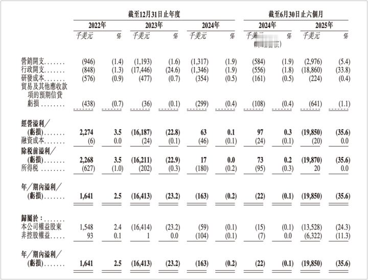 这两次股份支付直接导致公司在相应期间出现巨额亏损。加回以股份为基础的付款后,2023年及2025年上半年的经调整净利润分别为5.9万美元和-2.2万美元,仍处在盈亏平衡点附近。