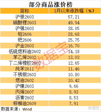 数据宝统计,截至1月27日收盘,银、碳酸锂、锡、铂、钯等多个品种1月以来涨幅超过20%;另外,金、低硫燃料油、苯乙烯、丁二烯橡胶、燃油、不锈钢等品种涨超10%。